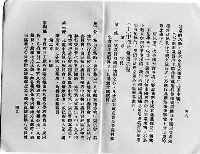 黨的章程,沿用條文形式,分為黨員、組織、會(huì)議、紀(jì)律、經(jīng)費(fèi)、附則,計(jì)六章、二十九條,約三千余字。關(guān)于黨員條件,規(guī)定的是承認(rèn)黨的宣言和章程并忠實(shí)為本黨服務(wù)者。與此相聯(lián)系的有:必須編入一個(gè)組織、參加黨的工作以及交納黨費(fèi)等。關(guān)于組織、會(huì)議等也都有可行的具體規(guī)定,其中,最重要的是宣布全國(guó)代表大會(huì)為最高機(jī)關(guān),大會(huì)閉會(huì)期間中央執(zhí)行委員會(huì)為最高機(jī)關(guān),從此奠定了中共中央領(lǐng)導(dǎo)制度的框架。此外,還包括有黨籍制度、組織構(gòu)建、會(huì)議辦法等等。