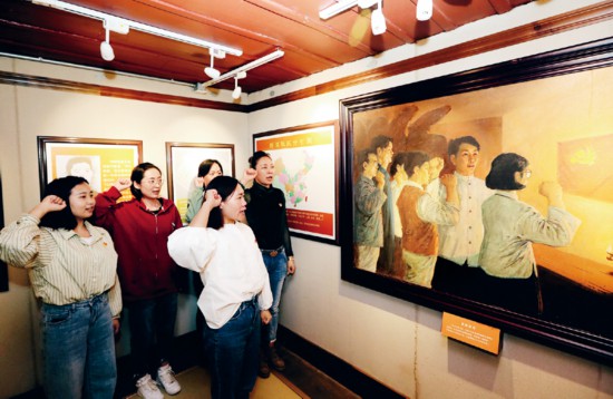 2021年4月2日,在云南省昆明市中共云南地下黨建黨舊址,當地社區黨支部開展主題黨日活動,緬懷革命先烈,接受黨史教育。圖為黨員們在重溫入黨誓詞。 人民視覺 楊崢/攝