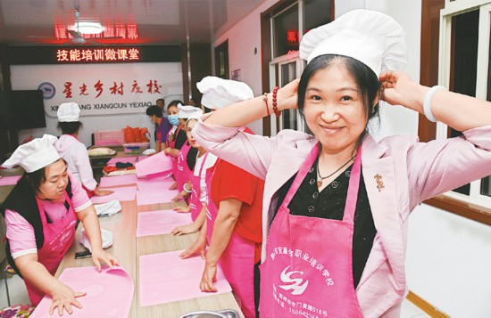 2021年以來,青島膠州市先后在24個鄉村(社區)扶持打造了35個村級夜校,開設育嬰師、面點師、電焊工等“接地氣”的培訓課程,幫助村民豐富精神文化生活、提高創業致富技能水平。圖為2021年8月31日,村民在夜校學習中式面點制作。 新華社記者 李紫恒/攝