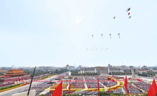 2021 年7 月1 日上午,慶祝中國共產黨成立100 周年大會在北京天安門廣場隆重舉行。這是大會開始前的飛行慶祝表演 饒愛民攝/ 本刊