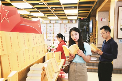 《習近平著作選讀》第一卷、第二卷出版發行后,社會各界掀起學習熱潮。圖為5月8日,江西省萍鄉市市民在新華書店翻閱《習近平著作選讀》第一卷、第二卷。 鄧建萍 攝