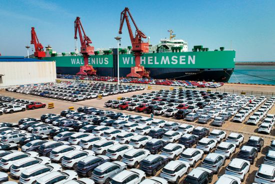 一艘滾裝船在江蘇連云港港東方港務(wù)分公司碼頭裝運(yùn)出口汽車(chē)(2023 年 5 月 16 日攝) 王健民攝 / 本刊