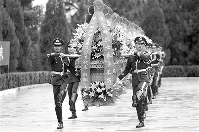 經黨中央批準,中國工農紅軍高級指揮員、軍事家黃公略烈士遺骸9月25日安葬在江西省吉安市東固革命烈士陵園。圖為禮兵向烈士墓敬獻花籃。 新華社發